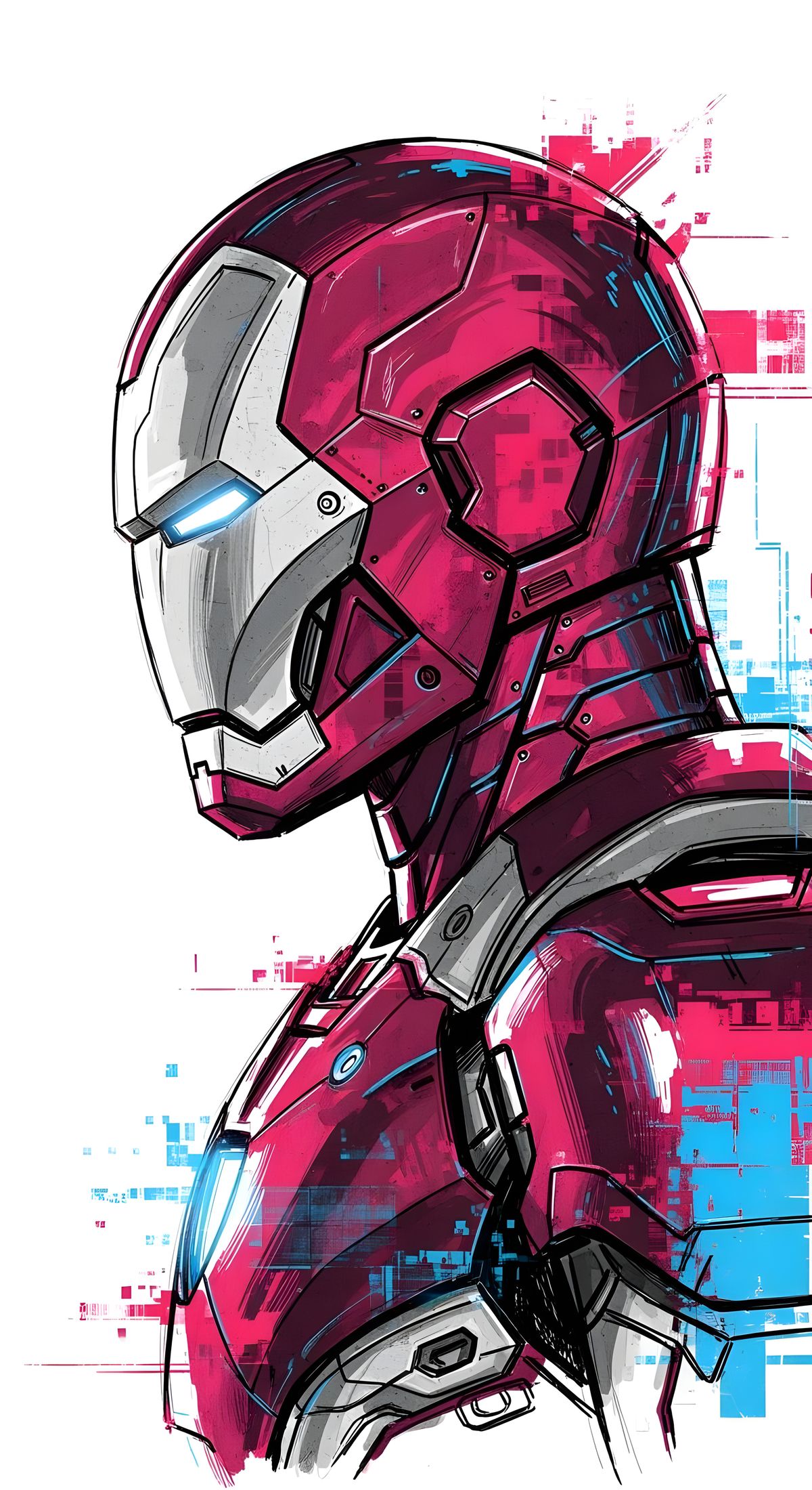 A glitch art portrait of Iron Man's face in black, white, pink, and blue. The image features chaotic scratch lines and fragmented textures in a cyberpunk aesthetic.