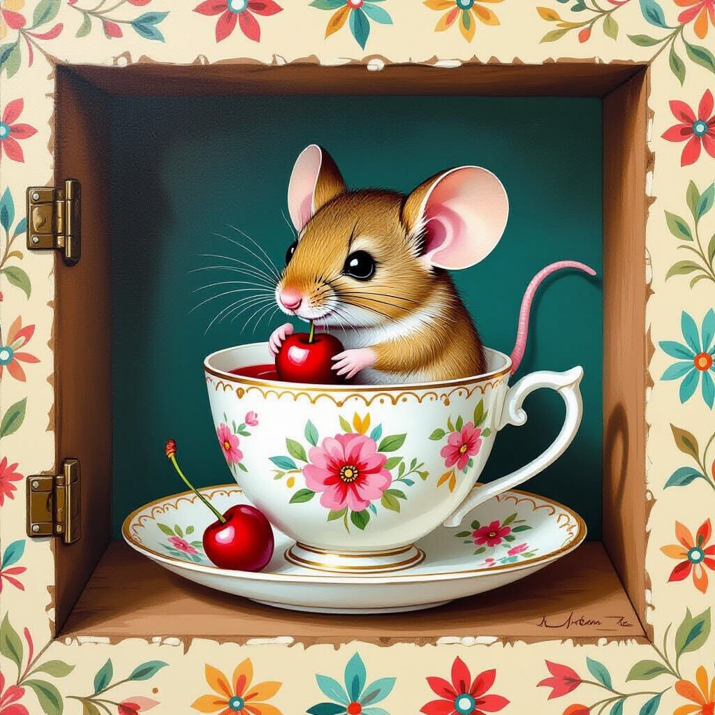 This image shows an adorable mouse enjoying a cherry inside a teacup, set within a cupboard. The artwork features vibrant, complementary colors and abstract patterns in a whimsical, illustrative style.