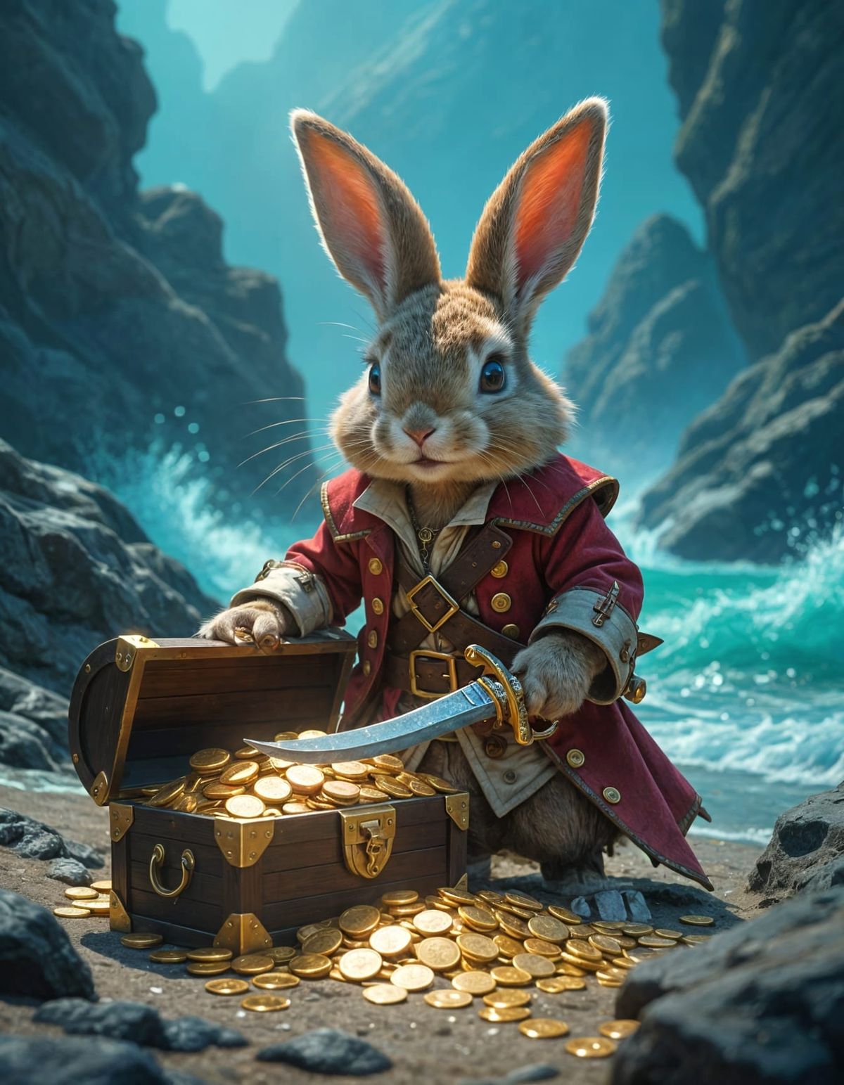 This image shows a pirate rabbit guarding a treasure chest overflowing with gold and jewels in a hidden cove. The scene is a detailed matte painting with deep colors and fantastical, intricate details.