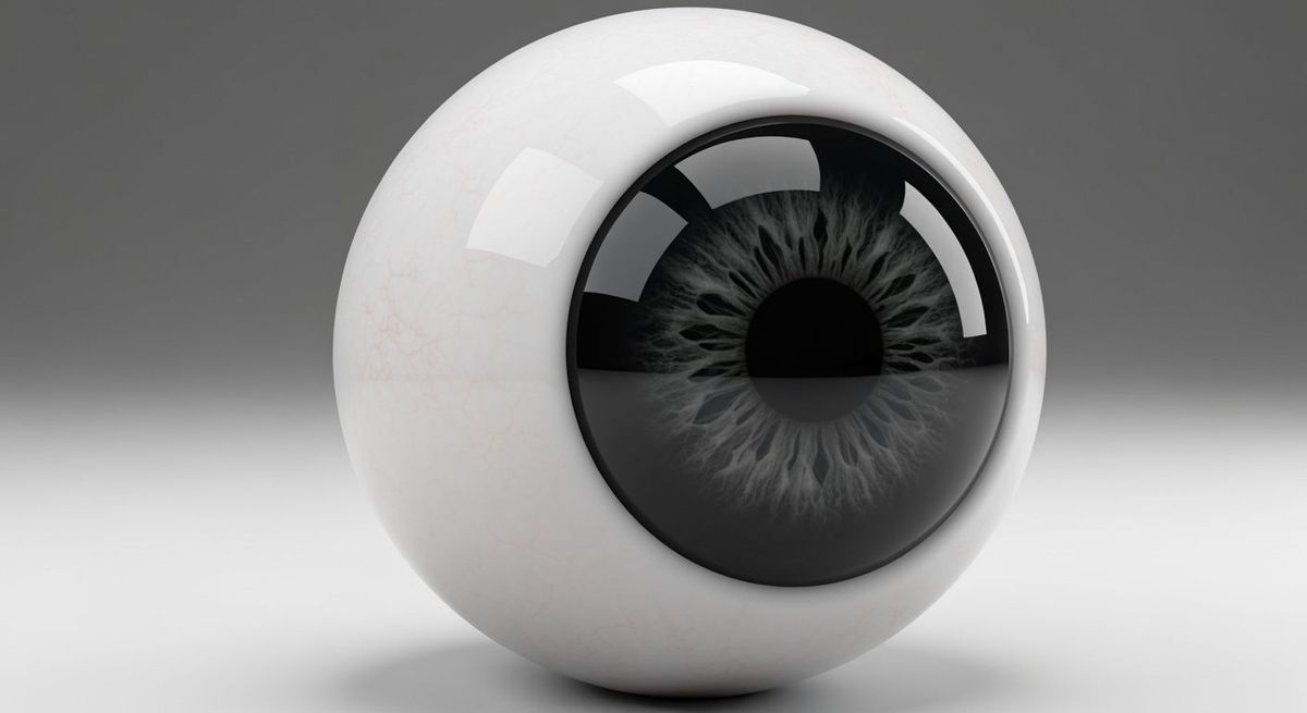 This image showcases a hyperrealistic 3D render of a human eyeball. It features a black sclera and iris, with a brilliantly white sclera. The eye is shown from a 75-degree angle, highlighted by soft studio lighting.