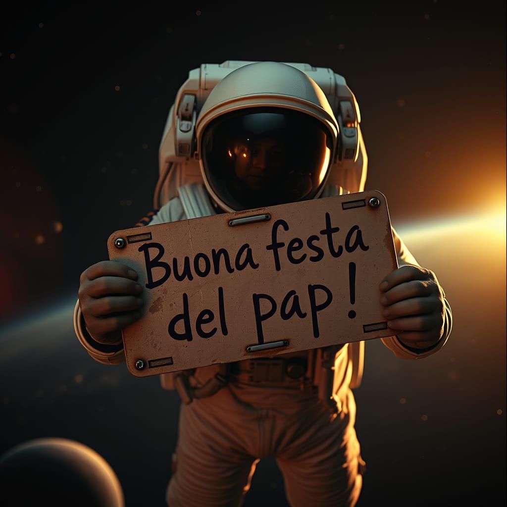 A nostalgic and cinematic image of an astronaut in space, holding a worn sign that reads 'Buona festa del papà!' in bold letters, surrounded by stars and planets, evoking a sense of wonder and nostalgia, reminiscent of classic film photography
