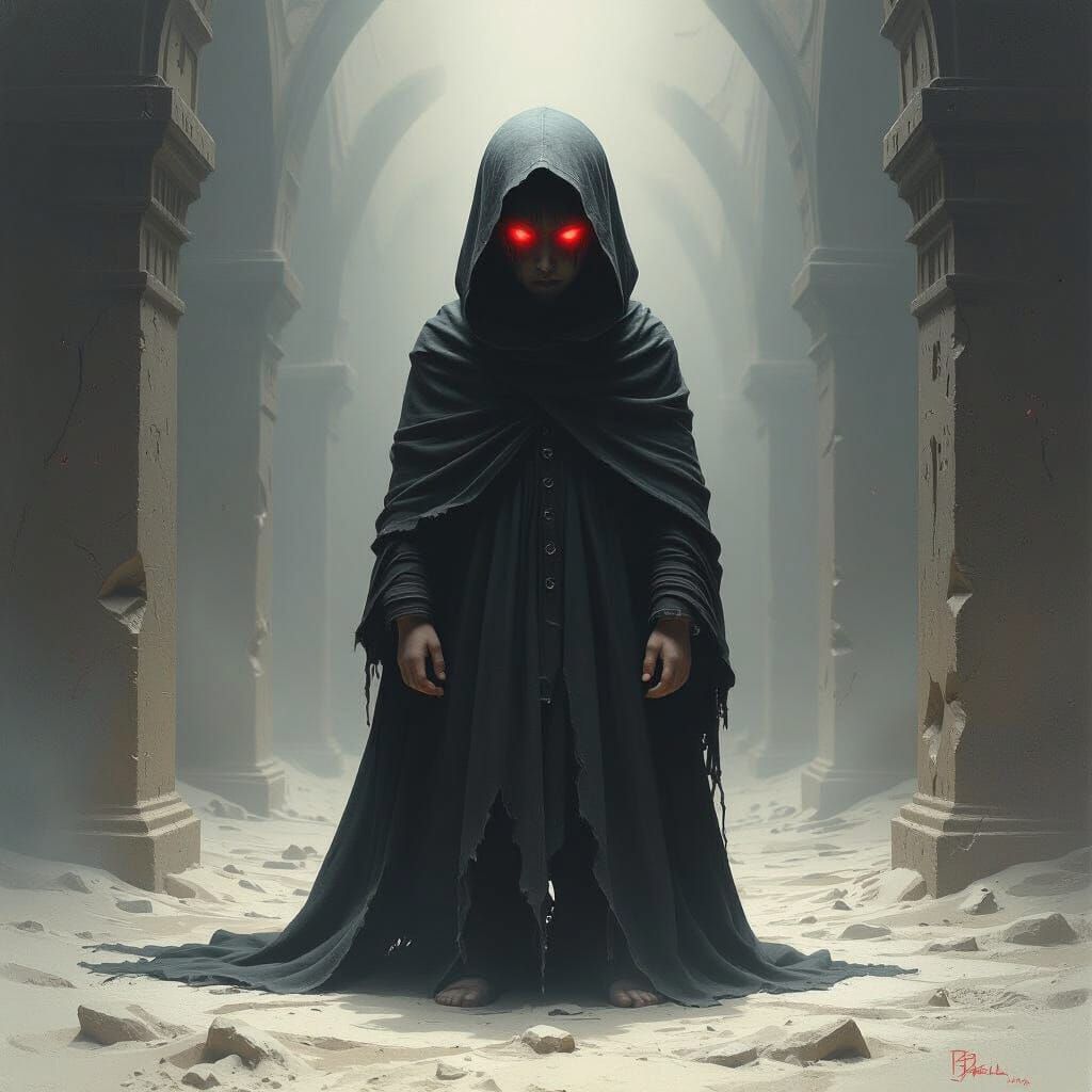 This image depicts a boy in a menacing setting, with red glowing eyes and eerie shadows. The artwork has a dark, gothic, and industrial aesthetic.