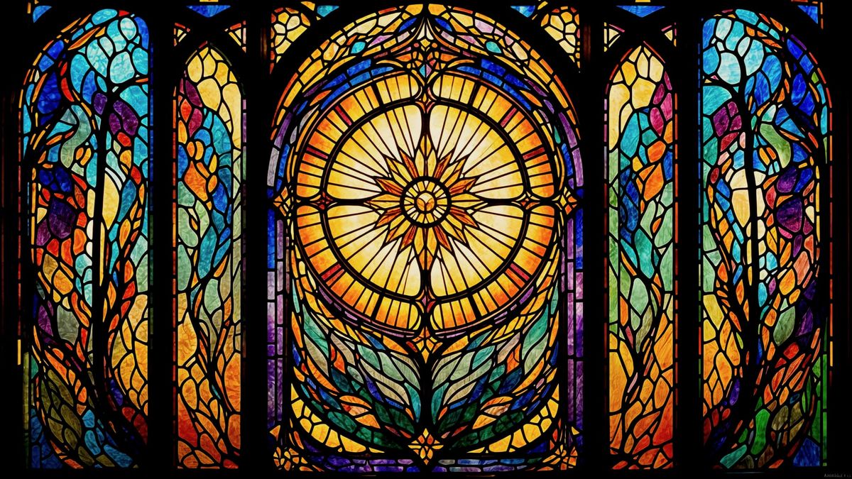 This image showcases intricate stained glass art with luminous effects, featuring a centered sunburst focal point. The design uses thick dark contours and glass-like facets for a crisp, vector-like finish.