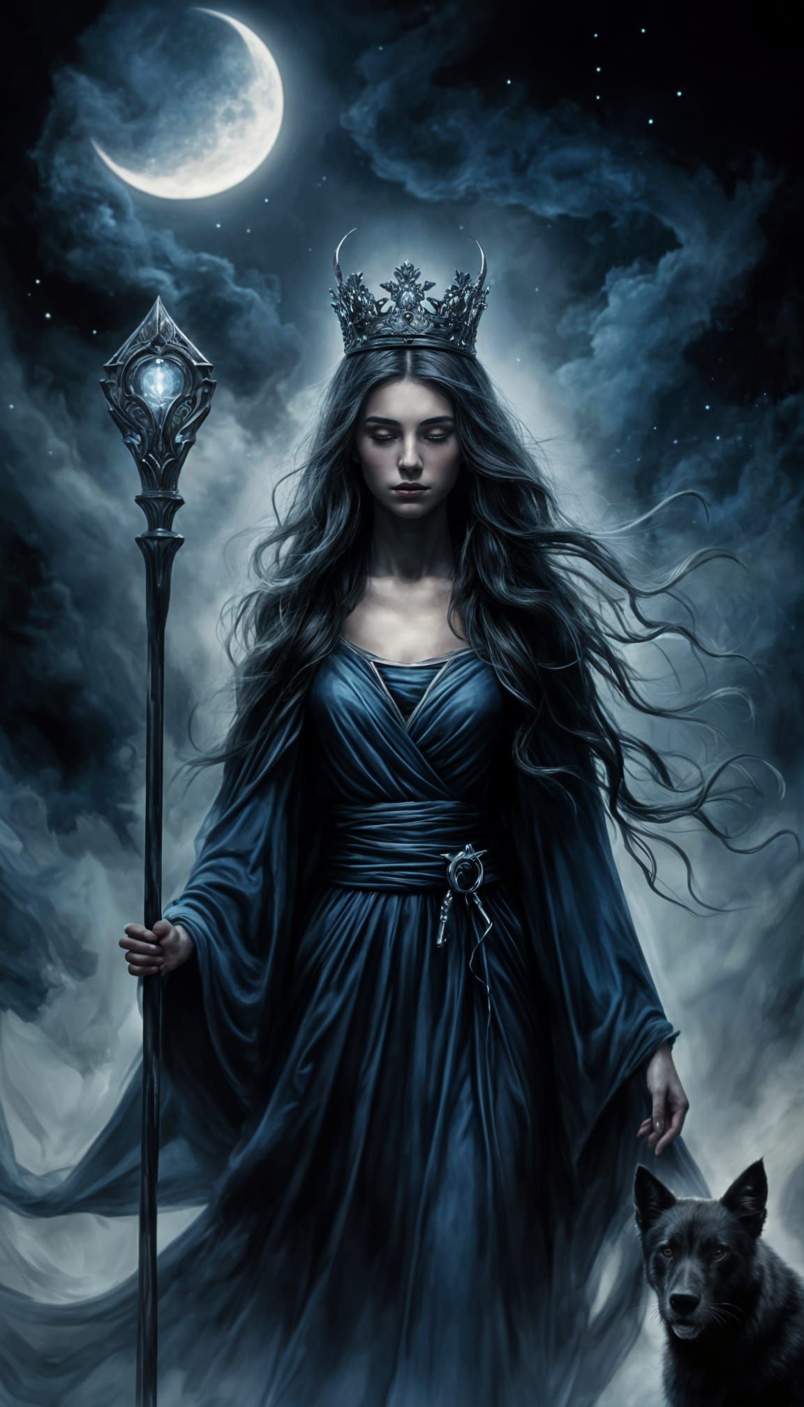 This image shows a powerful goddess figure with a moon crown and flowing hair, holding a torch. Shadowy dogs flank her, creating a dark, mystical, and dramatic atmosphere.