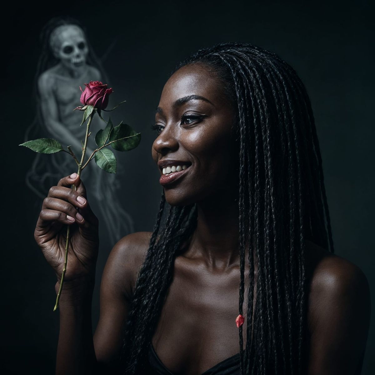 Striking editorial of a beautiful ebony-skinned african female with long thin braided hair, holding a dying rose, the rose itself can be seen with a faint spirit departing from the rose, giving the creation an eery and creepy effect, she is looking at the rose with a sinister smile on her face, as if ...