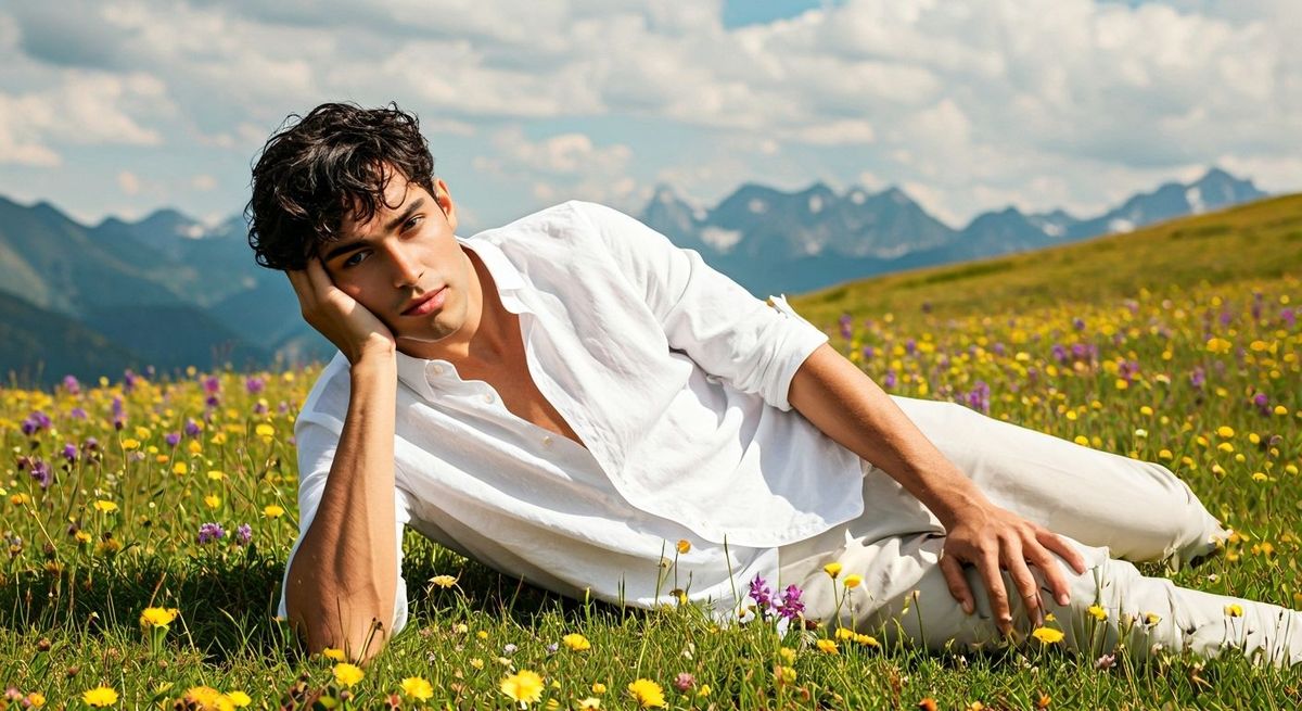 A photorealistic portrait of a young man relaxing in a vibrant mountain meadow. Captured with an 85mm lens, the image features natural lighting and a subtle bokeh effect.