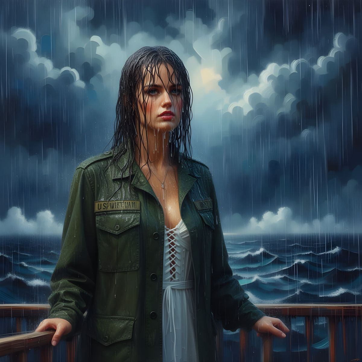 This oil and ink painting depicts a sad Princess Diana on a rain-soaked balcony overlooking a stormy sea. Her wet hair and dress cling to her as lightning illuminates the dramatic, brooding sky.