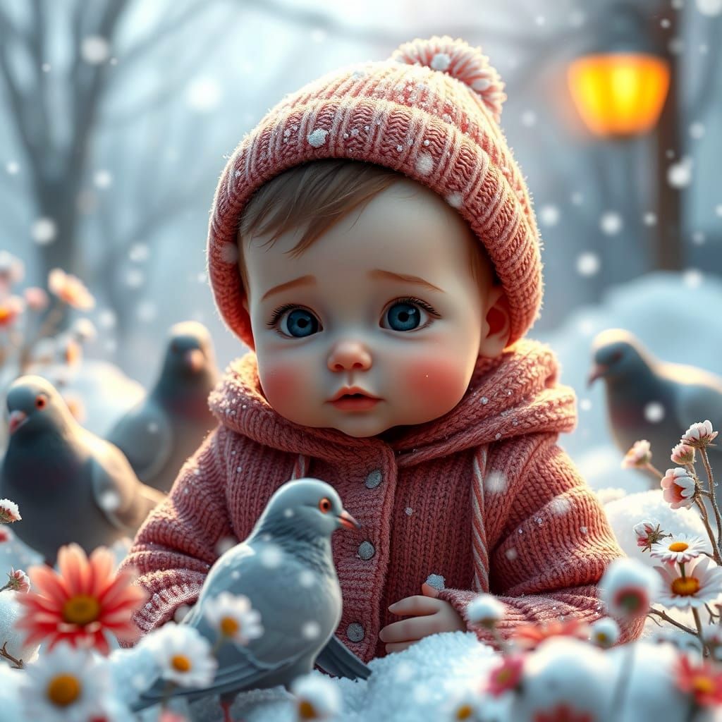A 3D rendered image of a baby surrounded by flowers, pigeons, and falling snow. The artwork features dramatic shading and depth.