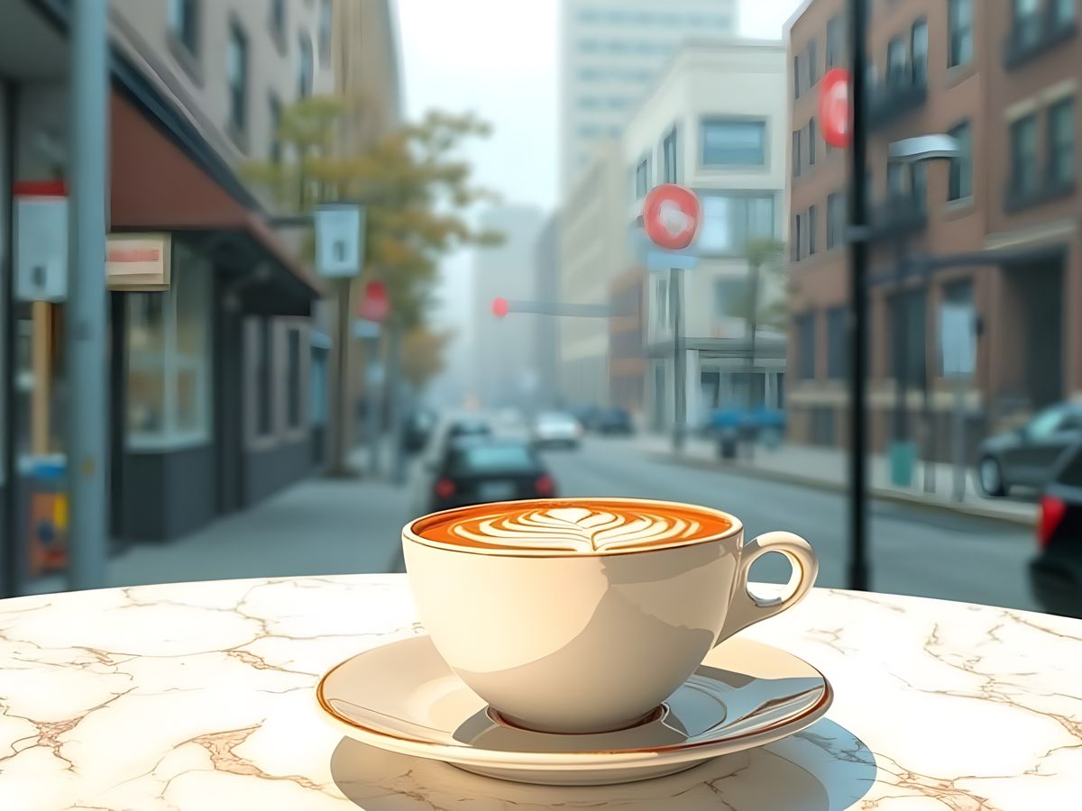 This image shows a half-finished latte on a marble table in a minimalist cafe. A blurred city scene with rain outside is visible. Rendered in a graphic novel art style.