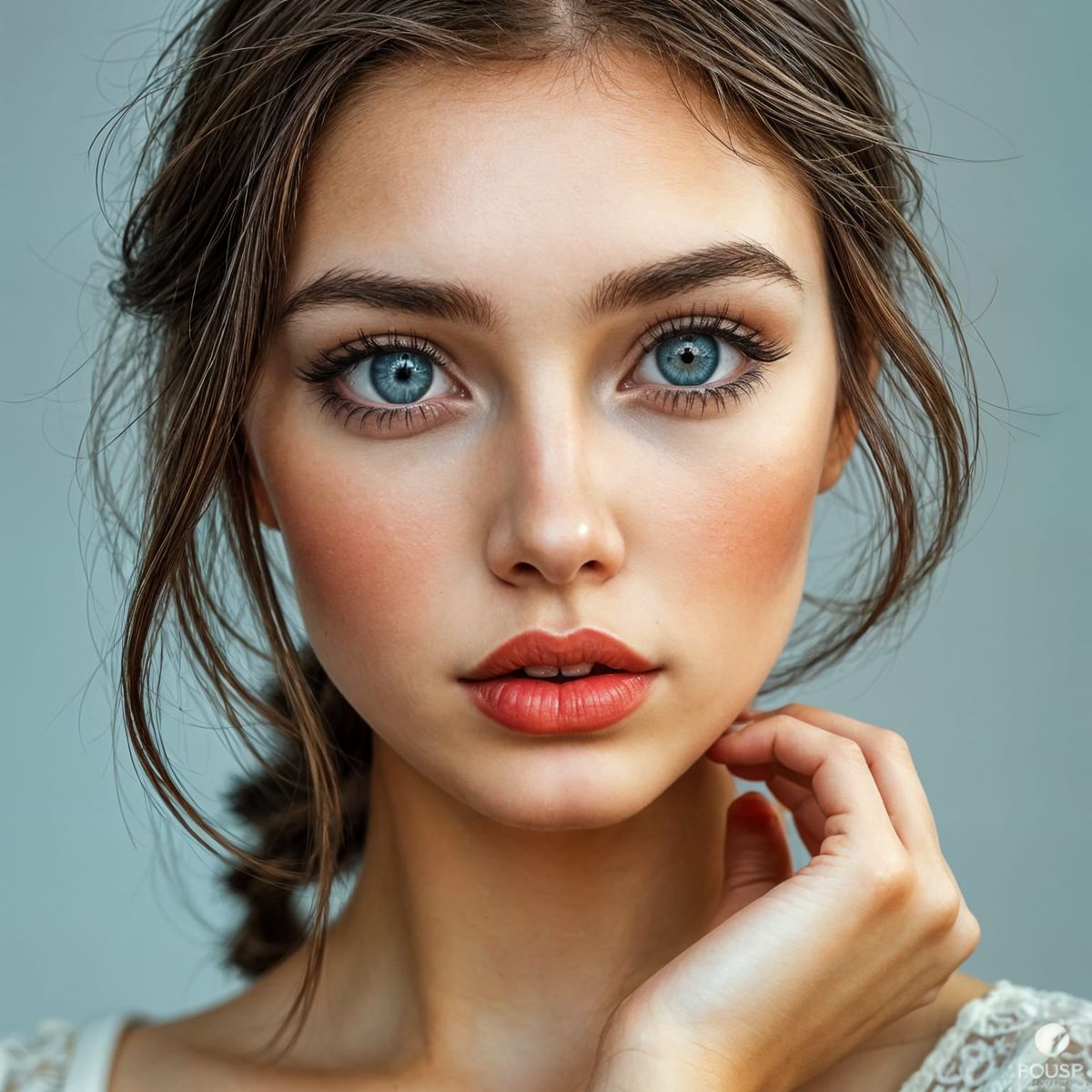 This image shows a realistic portrait of a young woman with brown hair, blue eyes, and full lips. It captures a detailed and lifelike representation of her features.