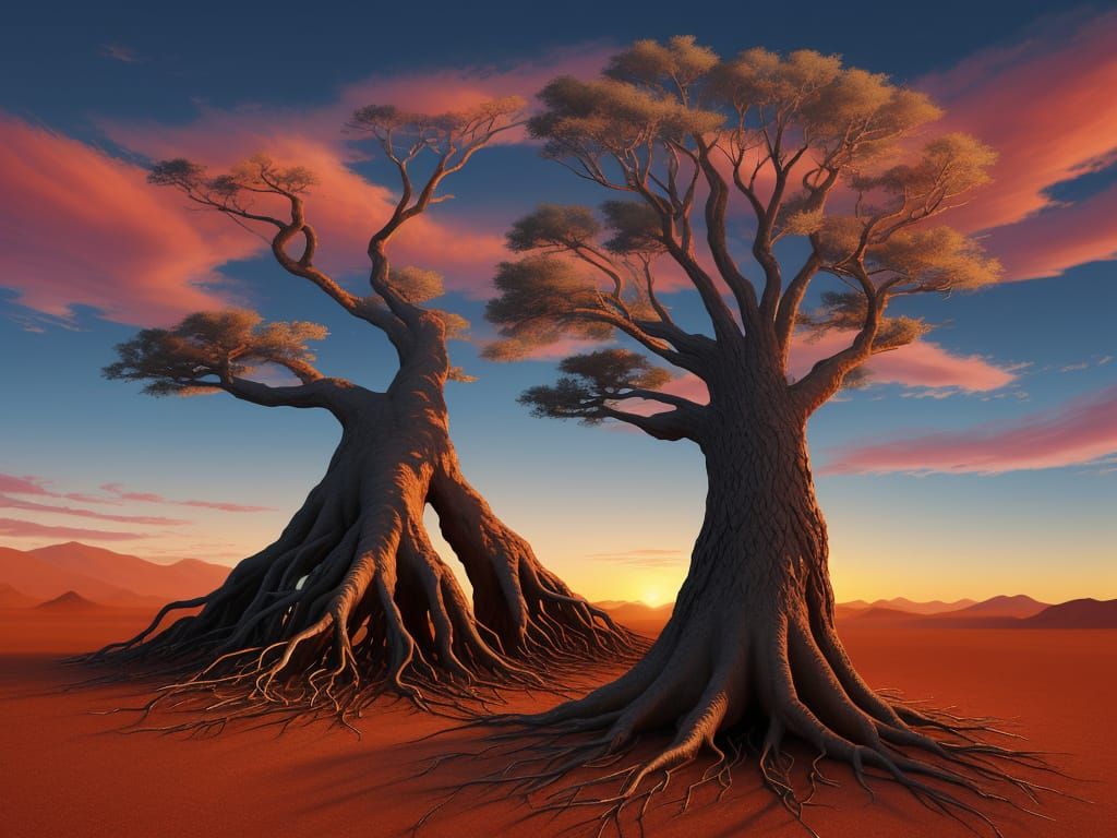 This dreamlike illustration features an abstract tree transforming into its branches and roots amidst a desert scene with a vibrant sunset.