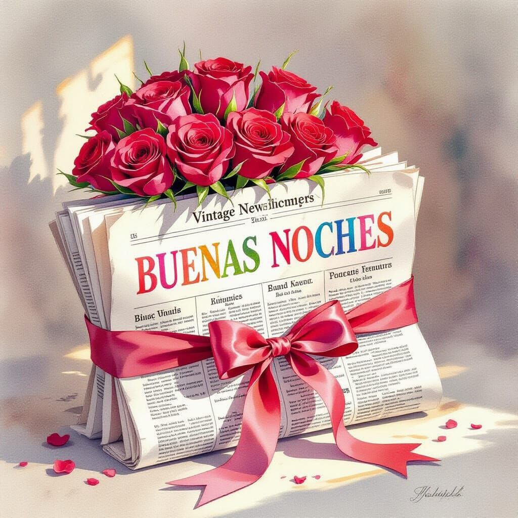 Vintage newspapers tied with roses and a "Buenas Noches โ," con letras de colores in high-definition watercolor, 3D rendering, multiple deta...