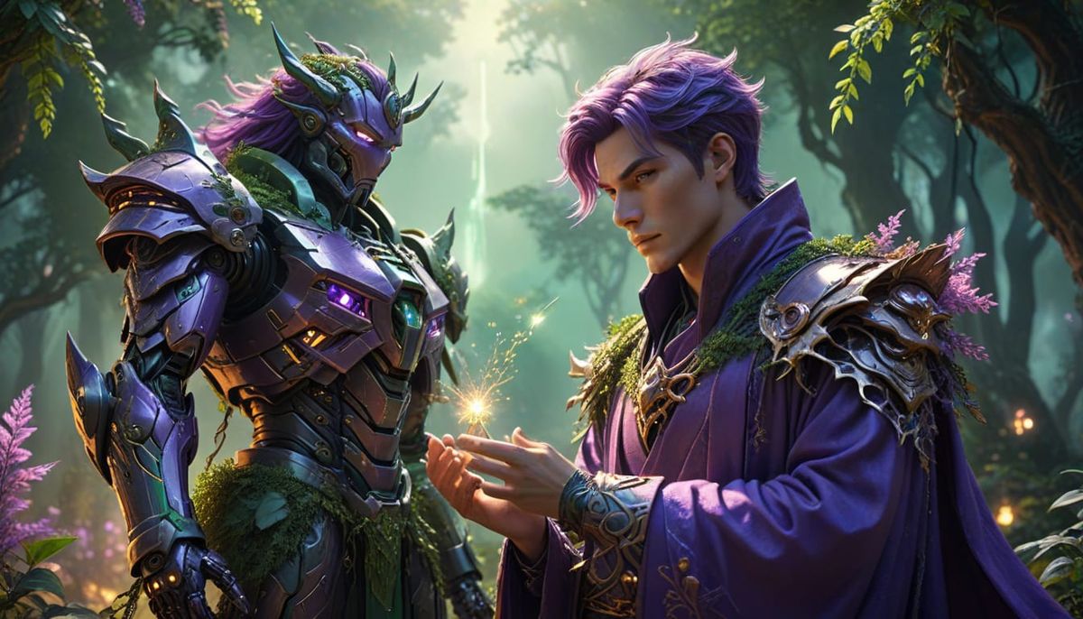 This image shows a king and a man in robes with a large mecha. The digital art features vibrant colors, a bokeh effect, sprites, vines, and a soft mist in a fantasy anime style.