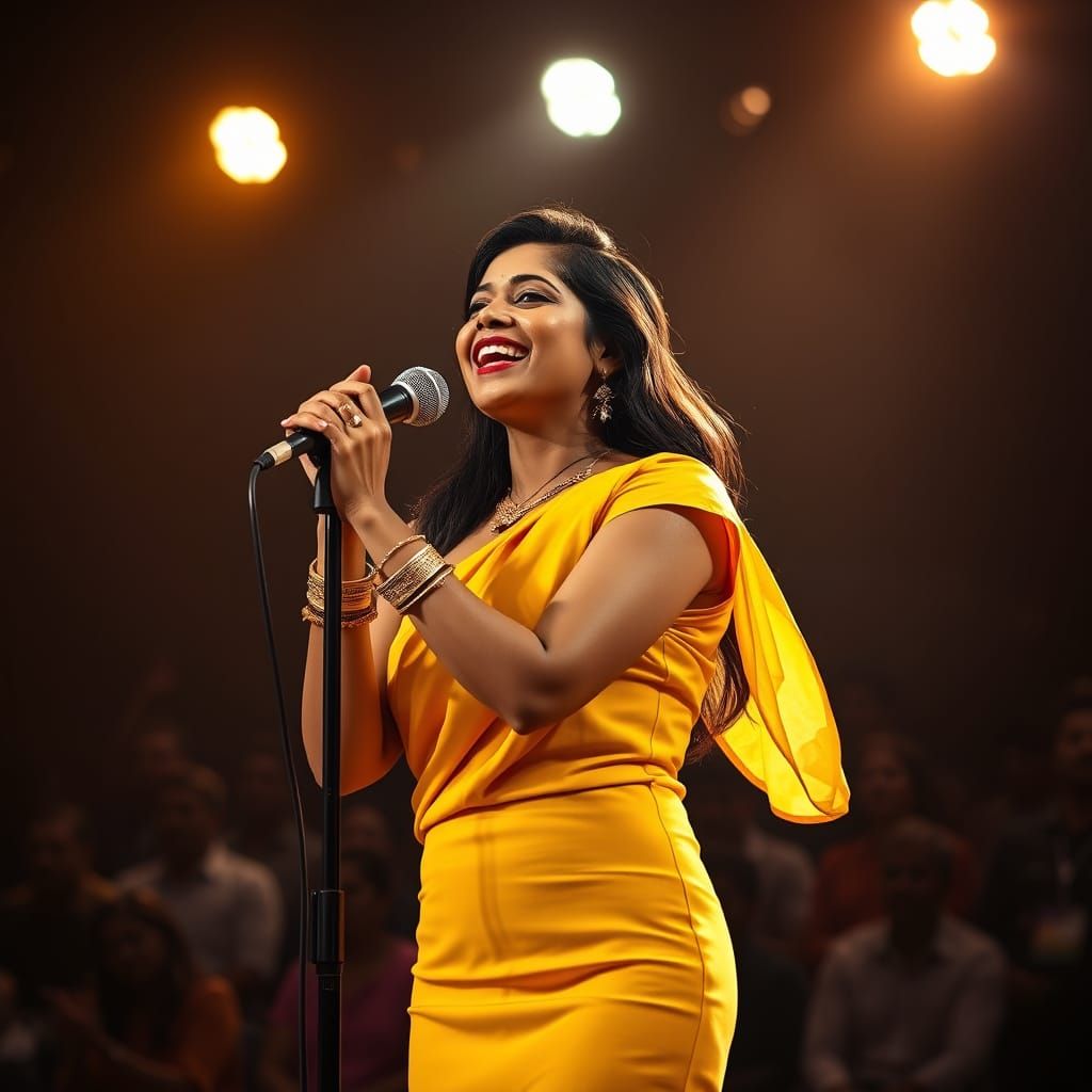 This image shows a woman in a vibrant yellow pencil skirt singing with passion on a stage. Photorealistic style with cinematic lighting and shallow depth of field effects.