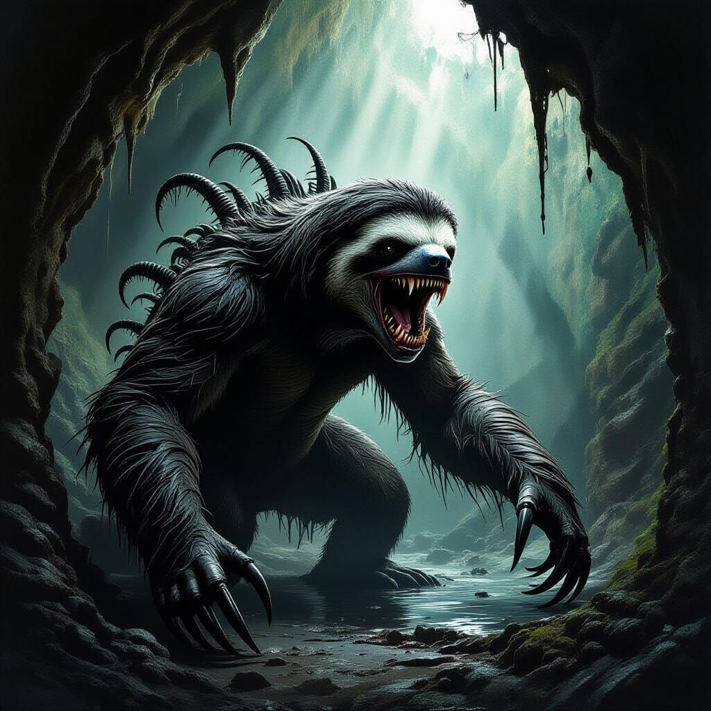 This image depicts a terrifying xenomorph evolved from a sloth, with elongated limbs and sharp claws. Rendered in a dark, intricate engraving style with dramatic chiaroscuro lighting.