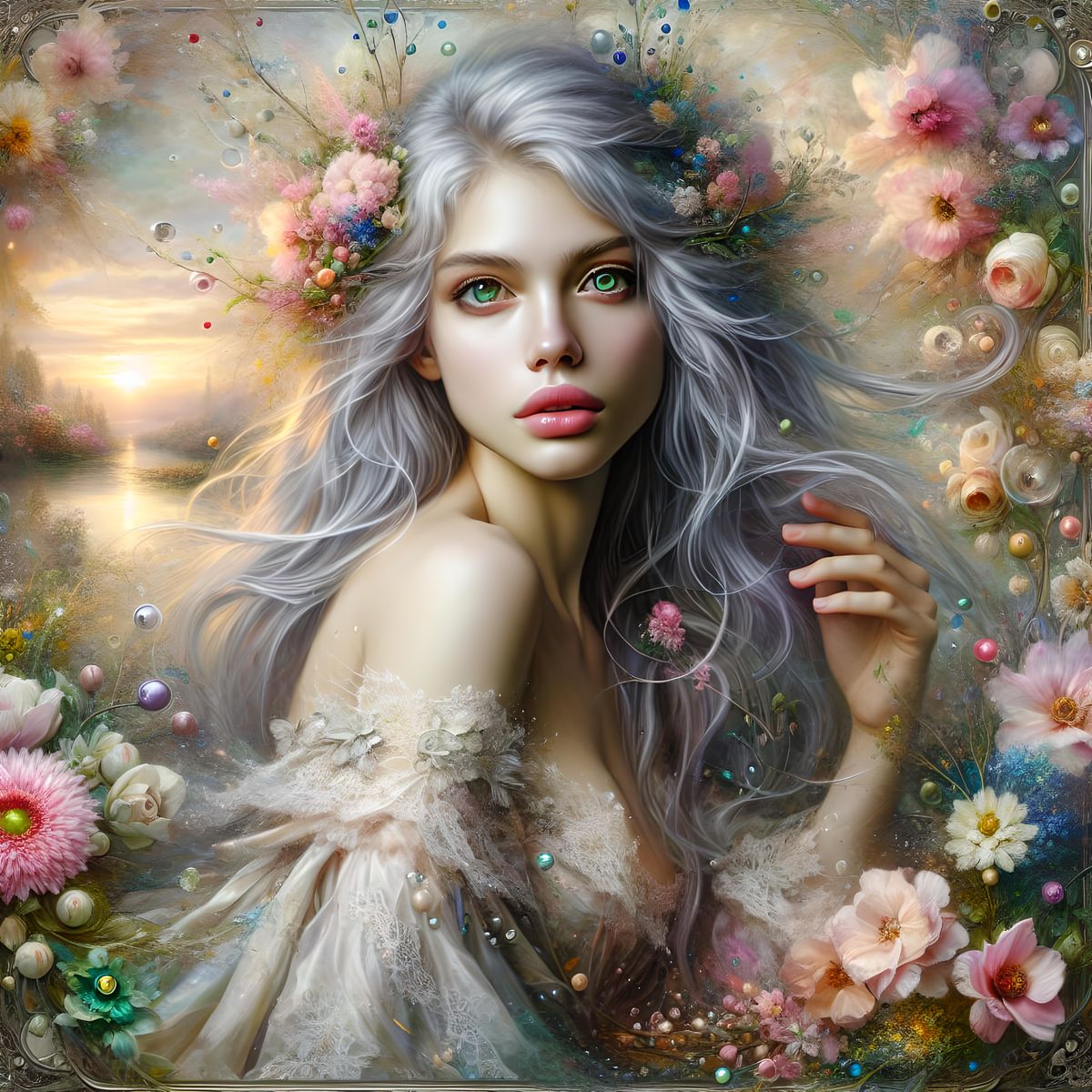 A stunning image of a silver-haired fairy surrounded by pastel spring flowers. She wears a silk lace dress and gazes directly at the viewer against a dreamlike sunrise in an oil painting style.
