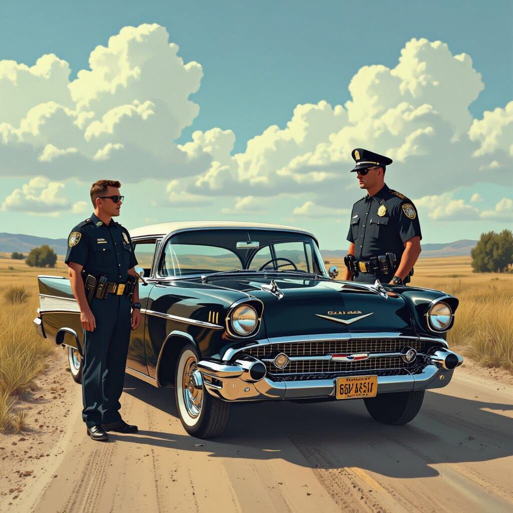 This image shows a man in glasses and a t-shirt sitting in a 1957 Chevy Bel Air on a quiet country road as a police officer stands nearby. The scene is rendered as a hyper-realistic digital painting.