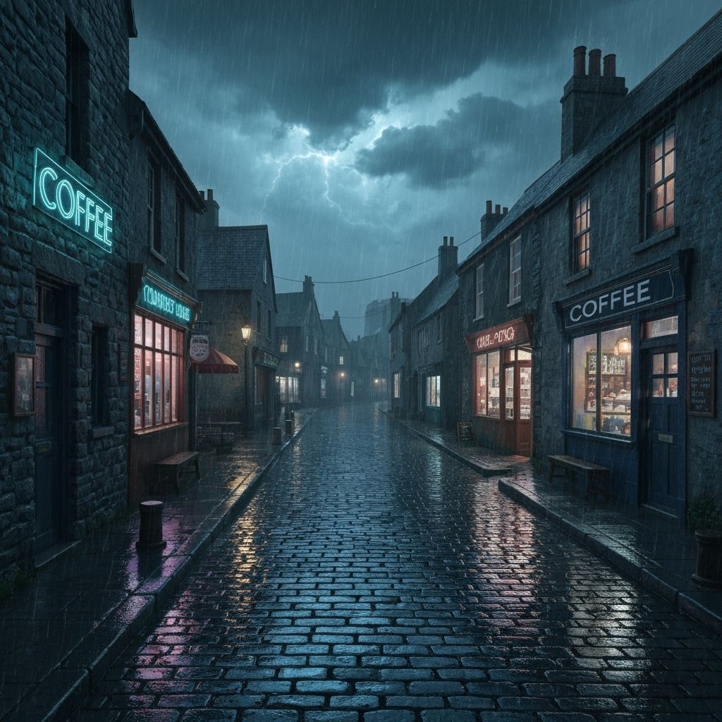 This image shows a quaint seaside village at night during a storm. Cobblestone streets glisten in the rain, with coffee shops glowing along the quay, depicted in a graphic novel style with muted colors.