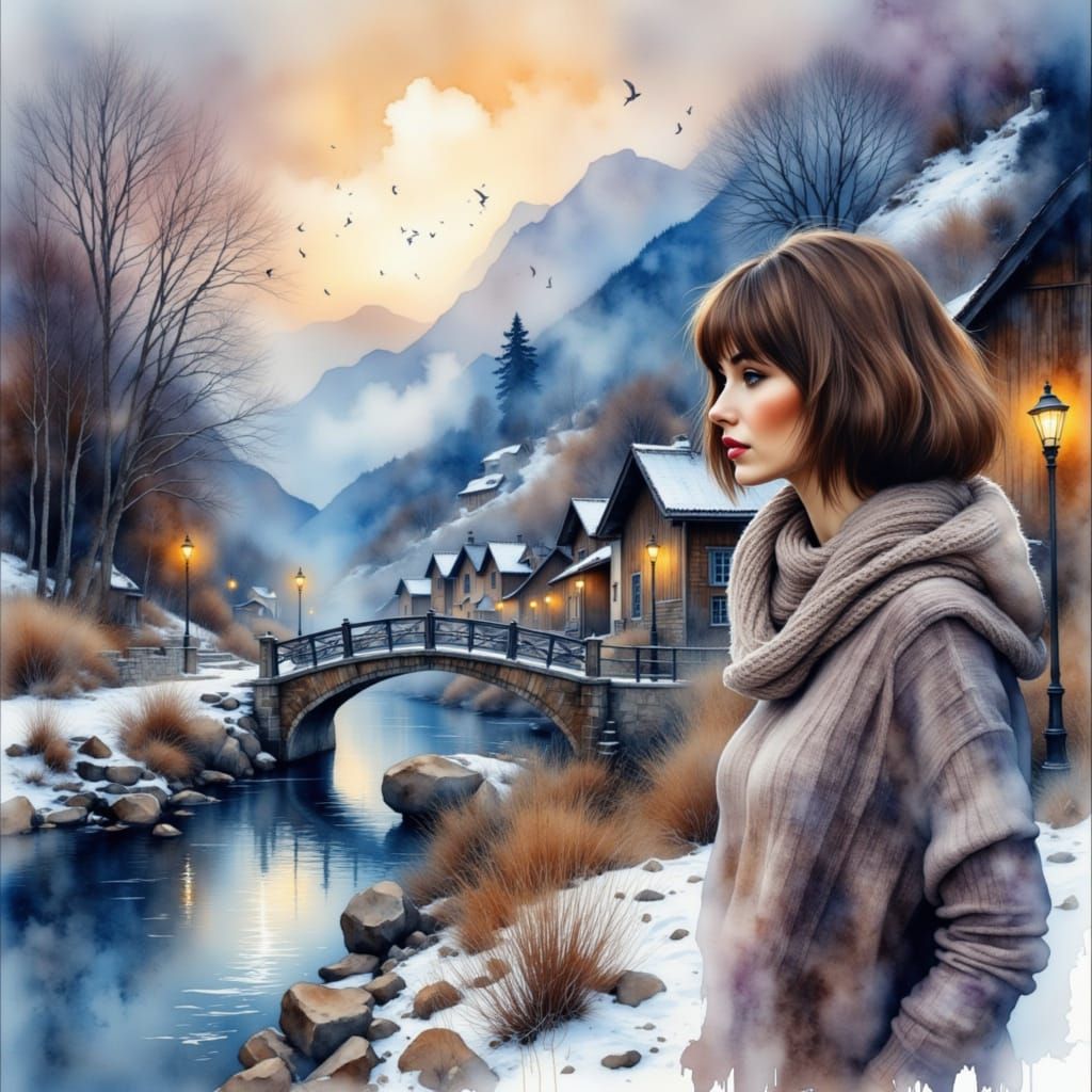 This image depicts a woman in winter attire walking near a river under a twilight sky. The artwork features soft, dreamy gradients and ethereal backlighting, rendered in a digital matte painting style.