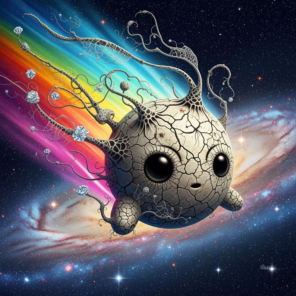 This image shows a baby-like comet with a textured, stony body and large innocent eyes, set against a glittering galaxy. Intricate cosmic tendrils connect it to a vibrant universe with a rainbow trail.
