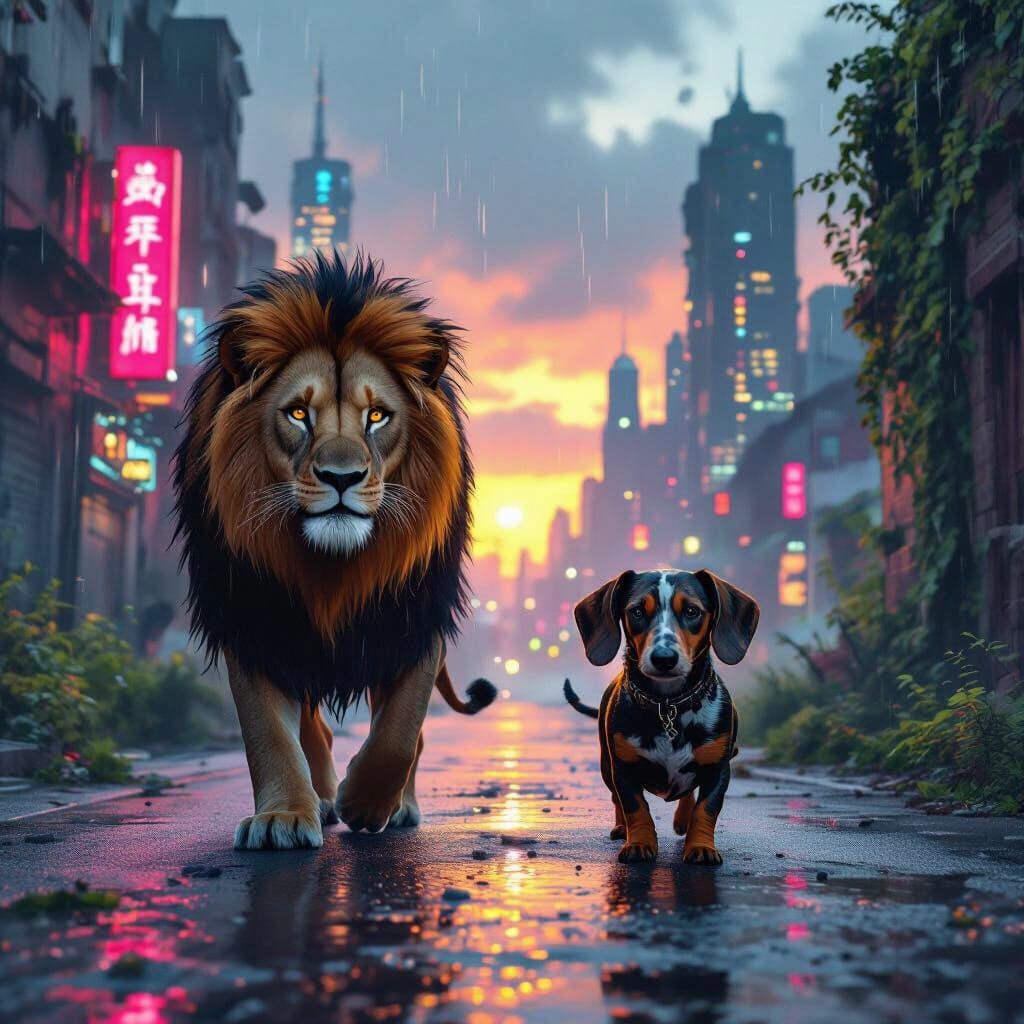 This image shows a lion and dachshund walking down a street divided between a neon-lit cyberpunk cityscape and ivy-covered ancient ruins. The scene is rendered with gritty photorealism and dystopian futurism.