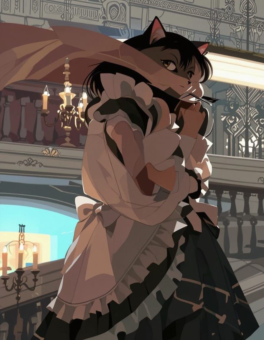 This image features a charming cat girl in a maid outfit within a lavish Victorian mansion. Rendered with rich textures and a warm palette, it evokes Art Nouveau elegance.