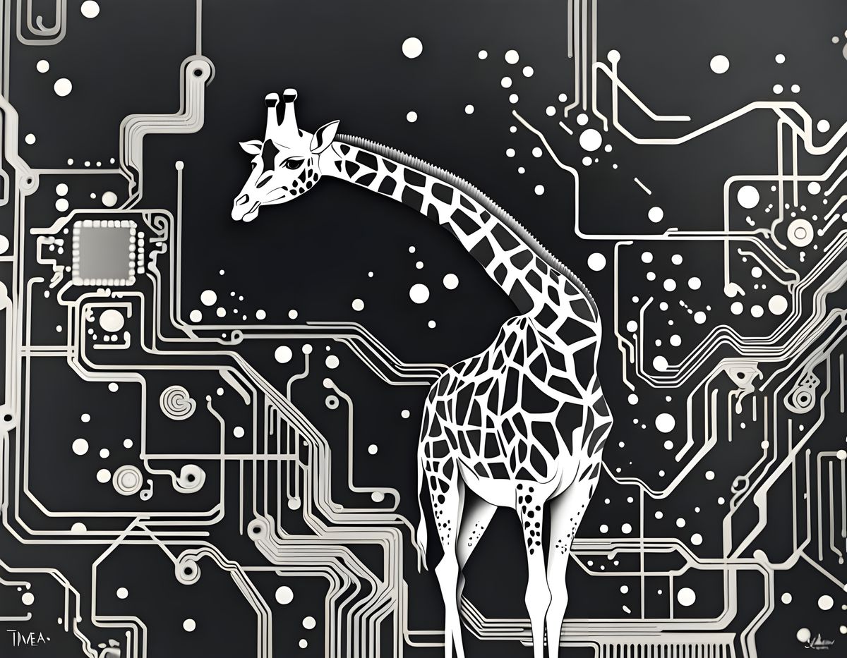 This charcoal drawing blends a giraffe with circuit board motifs, featuring experimental music notation, occult glyphs, and a winding river, evoking the flow of time.