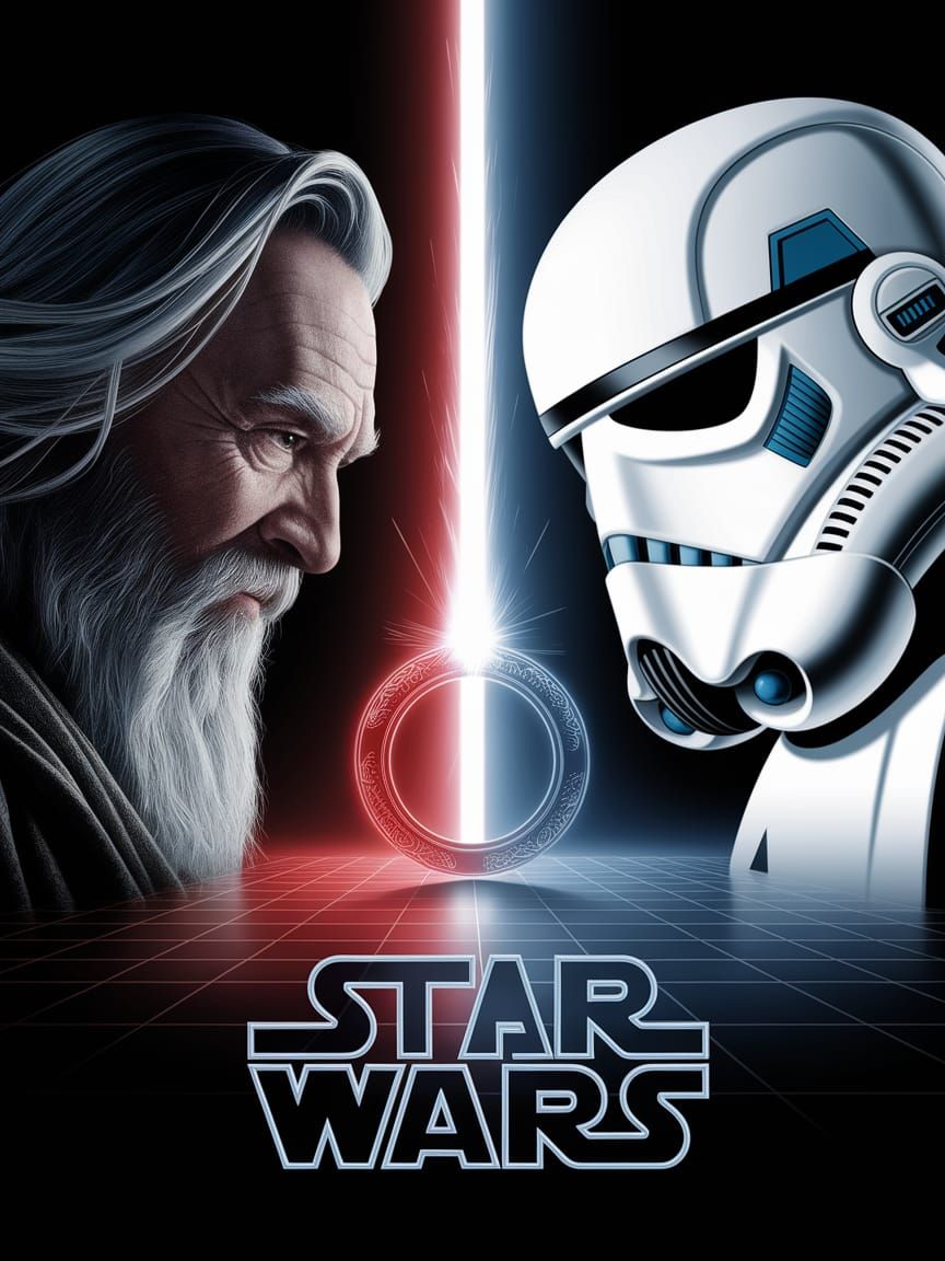 A movie poster depicting a Star Wars and Lord of the Rings crossover. Gandalf faces a stormtrooper with the One Ring between them, rendered with shiny colors in a cinematic, sci-fi style.