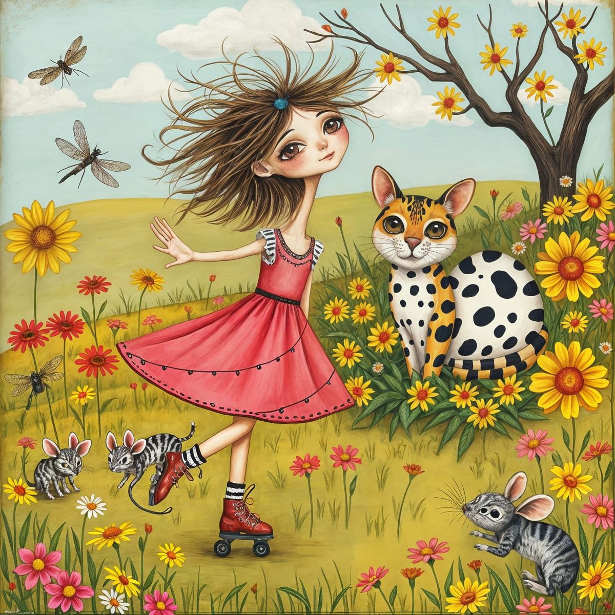 A vibrant image of a girl on roller skates in a wildflower meadow, appearing slightly off-balance. The scene includes a cat with a crown, patterned mice with antlers and surreal details in strong colors, reminiscent of mixed-media art.