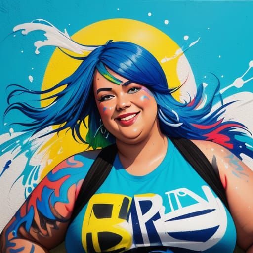 A vibrant urban graffiti artwork of a smiling plus-sized woman with blue hair and arm tattoos. The close-up shot features melting oil gouache colors and bright acrylic paint splatters in a street art style.