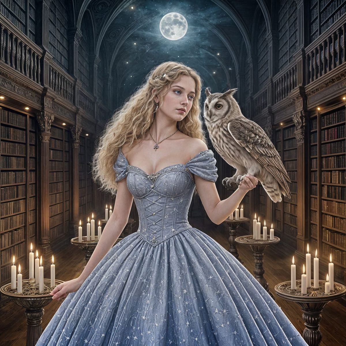 A captivating image of a woman in a library, reminiscent of pre-Raphaelite paintings. The scene, illuminated by moonlight and candles, features arcane artifacts and a wise owl, creating an atmosphere of enchantment.