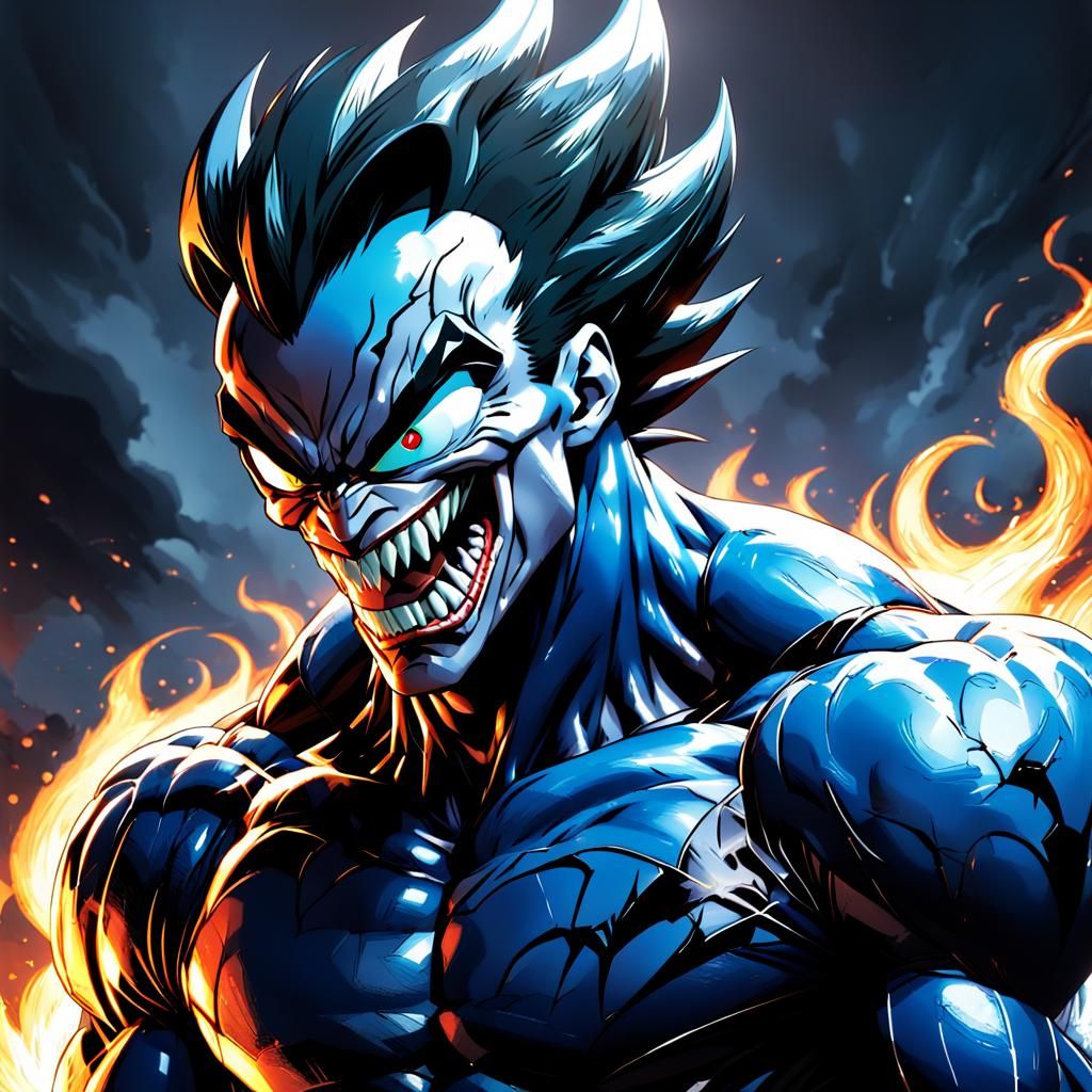 This anime-inspired image features a dynamic fusion of Venom and Vegeta, showcased with cinematic lighting and cel-shaded colors, reminiscent of Studio Trigger's style and Clip Studio Paint's capabilities.