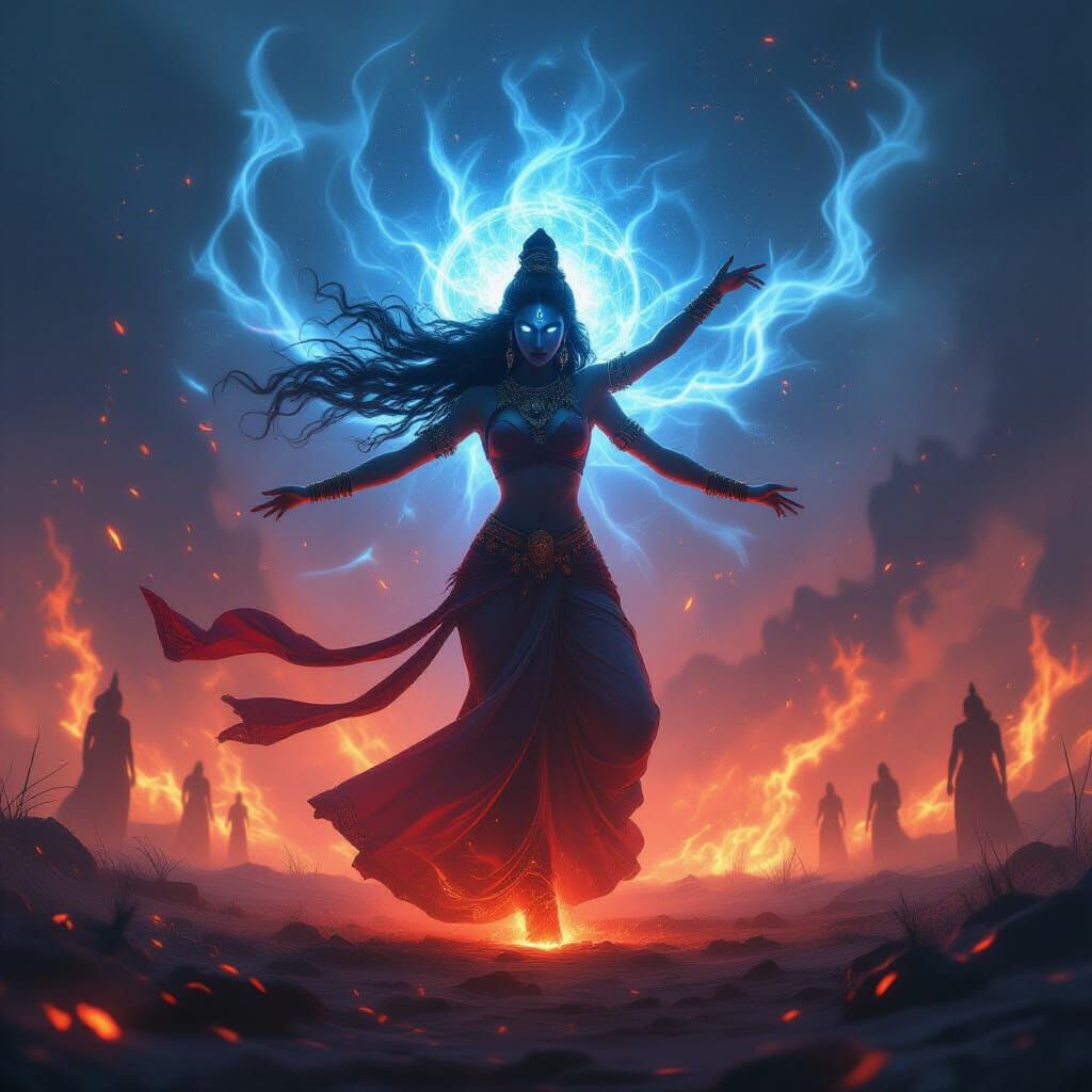 A hyper-detailed 8K cinematic image of Goddess Kali dancing across a stormy battlefield, radiating blue and crimson light. Celestial symbols and swirling winds signify divine transformation. Mythological grandeur and epic energy.
