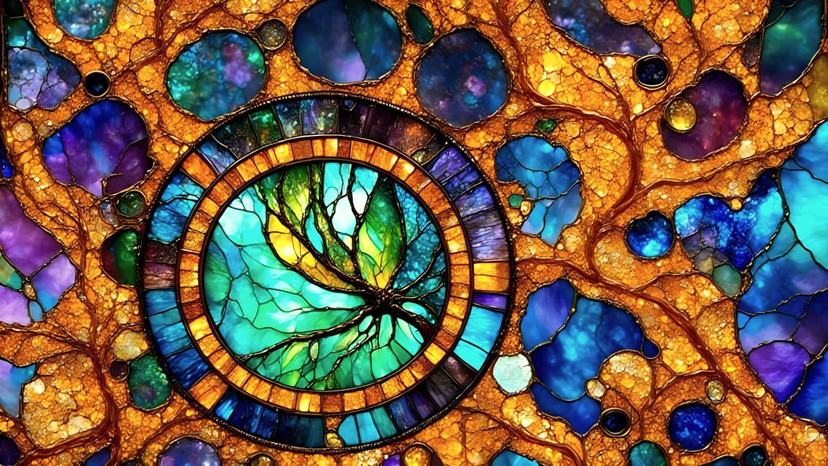 This image showcases a detailed Kintsugi-inspired orb crafted from abalone and pearl stained glass, illuminated by dappled golden sunbeams and set against an apple blossom background. Rendered in jewel tones with volumetric lighting.