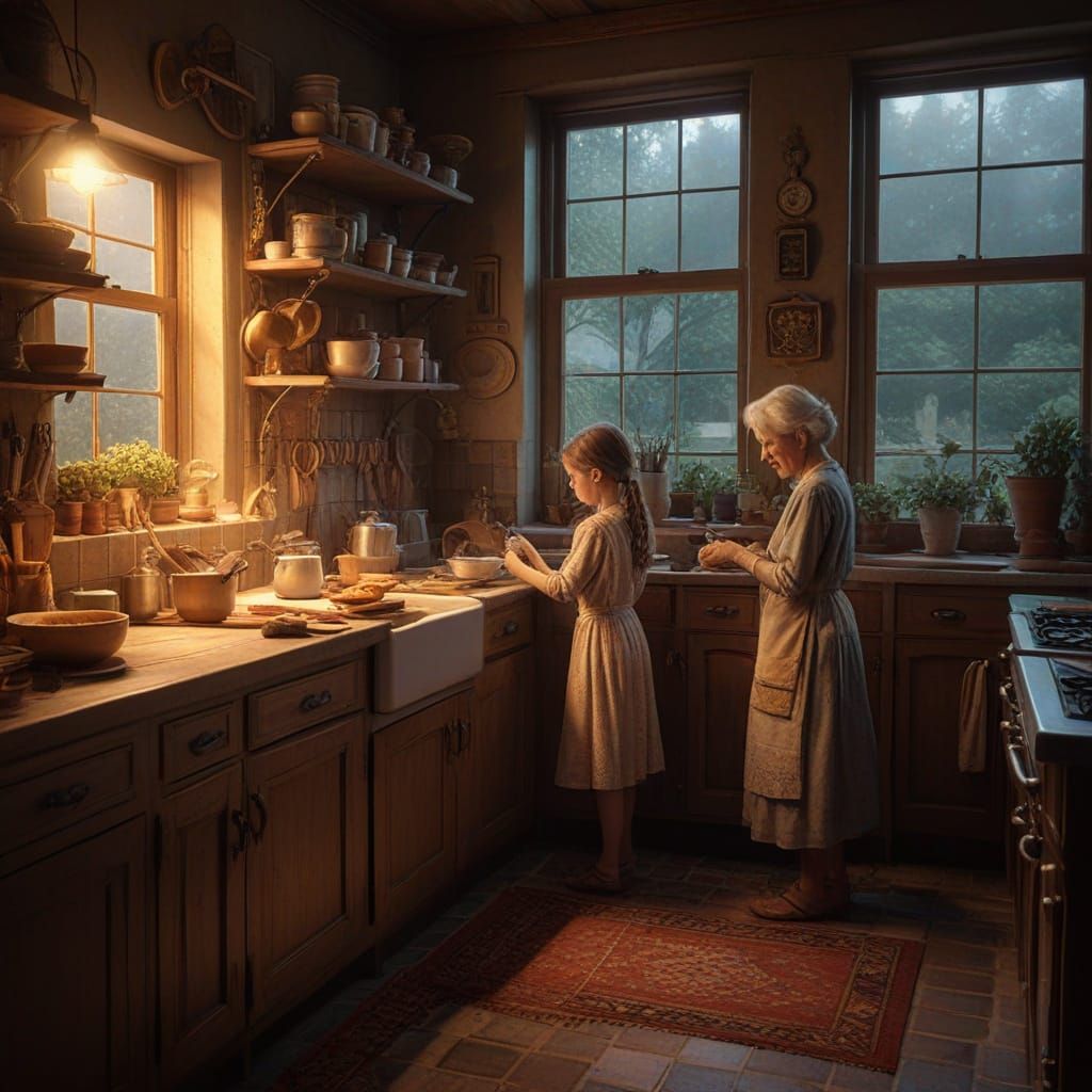 A cozy scene of a grandmother and granddaughter cooking together in a vintage kitchen, bathed in warm golden light. The image is a digital painting with a rich, detailed, and atmospheric feel.