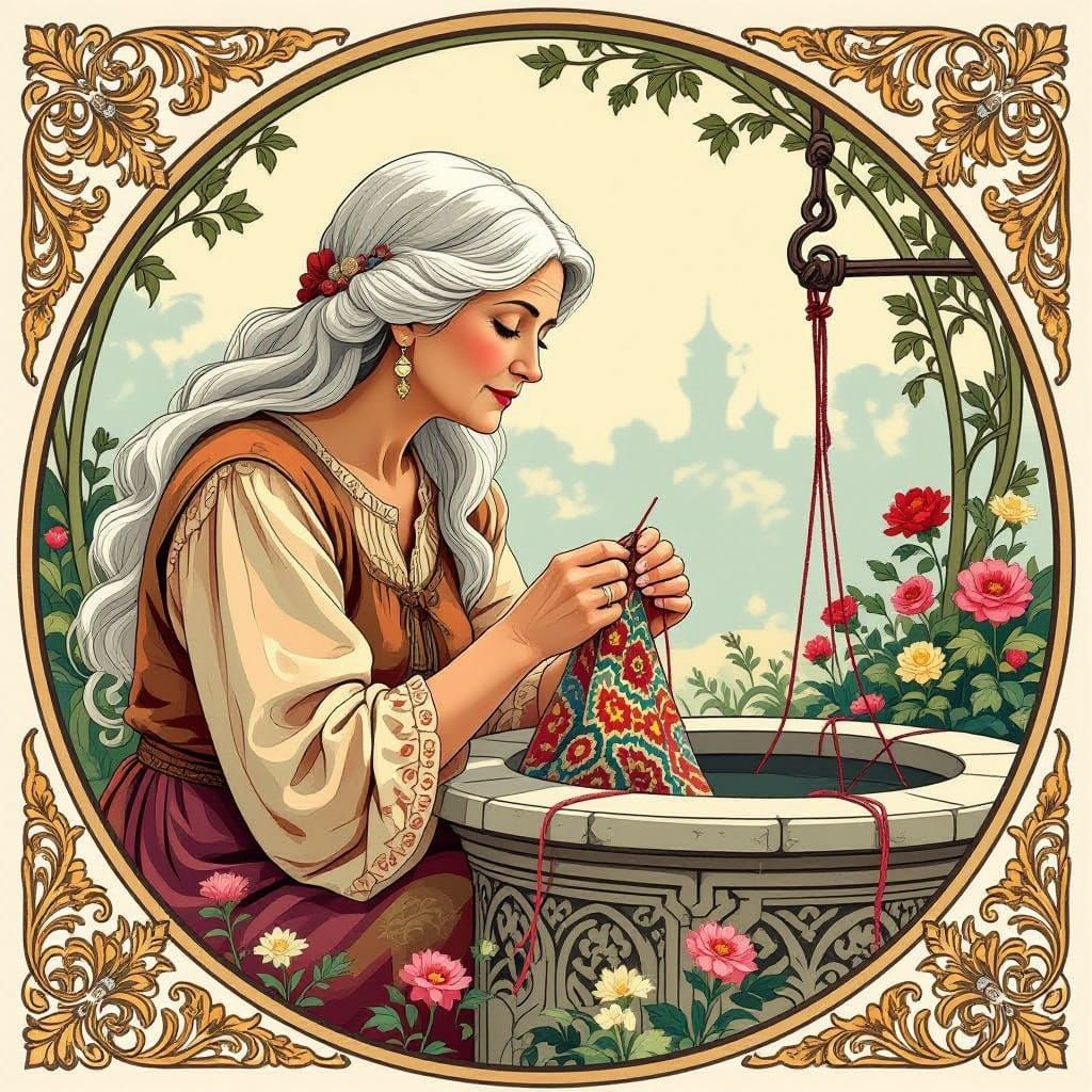 This Art Nouveau illustration shows an elderly woman knitting by a decorative well. The artwork features organic lines, natural colors, and a warm, nostalgic atmosphere with diffused light.