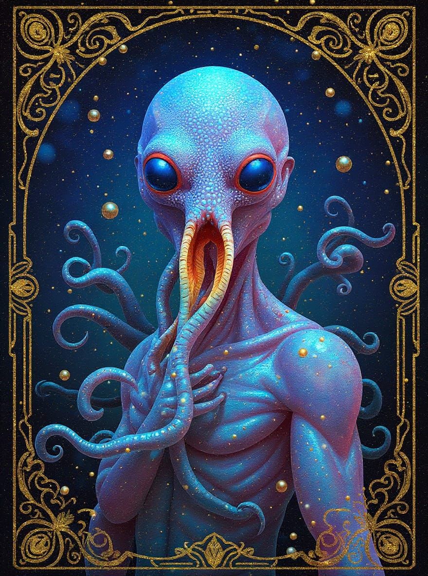 This image features a blue-eyed alien visitor in a surreal minimalist portrait, adorned with organic art nouveau and Arabesque patterns. Rendered in a dot painting style with glitter rain.