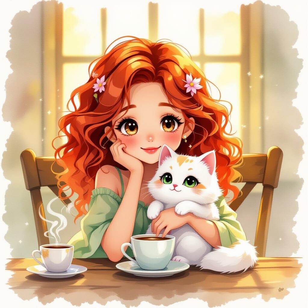 This image shows a Black girl with red hair holding a white cat. She's sitting at a table with coffee, wearing a green dress, and bathed in golden light, rendered in an anime watercolor style.