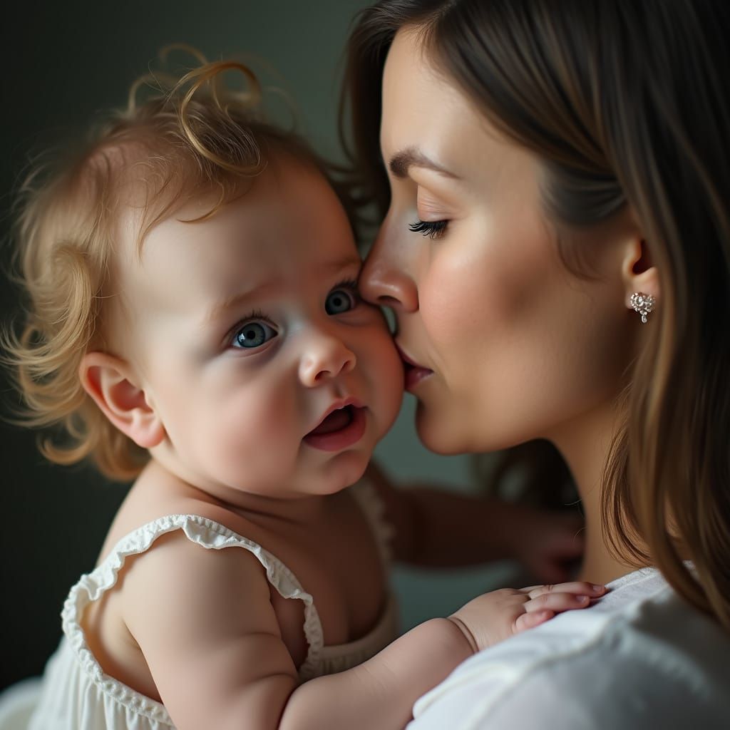 A hyperrealistic image of a mother kissing her baby, captured with intricate details and sharp focus. The composition features high contrast and a beautifully shot scene.