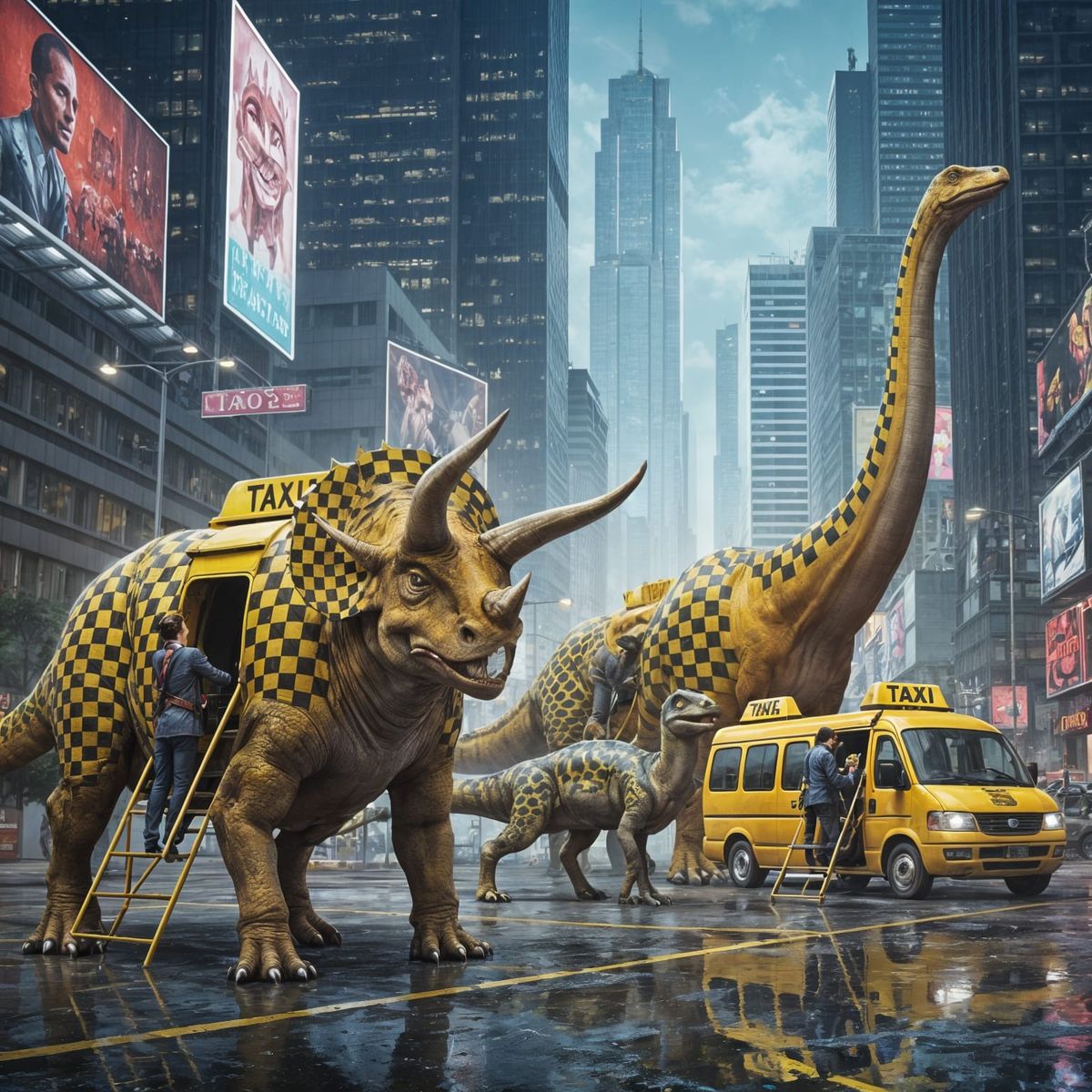 This image shows dinosaurs painted as taxis in a busy city parking lot. Commuters are climbing aboard the triceratops, velociraptors, and brachiosaurus for their morning commute in this hyperrealistic digital artwork.