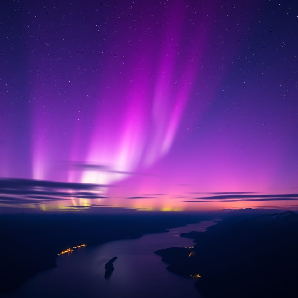 This hyperrealistic image captures a serene night sky above Norwegian fjords, showcasing a vibrant aurora borealis in shades of purple and plum with cinematic, moody lighting.