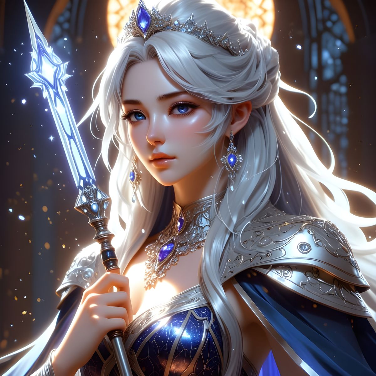 This stunning image features a celestial empress in a regal pose, with flowing silver hair and piercing violet eyes. She wears dark steel and indigo armor, contrasted by a flowing silk cape, and wields a divine scepter glowing with cosmic energy.