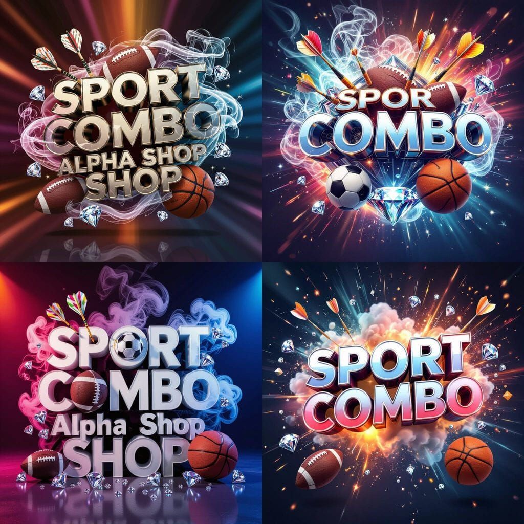 Hyperrealistic splash art featuring "SPORT COMBO Alpha Shop" 3D letters surrounded by sports equipment, smoke, and diamonds. Intricately detailed with dramatic lighting and a colorful background.