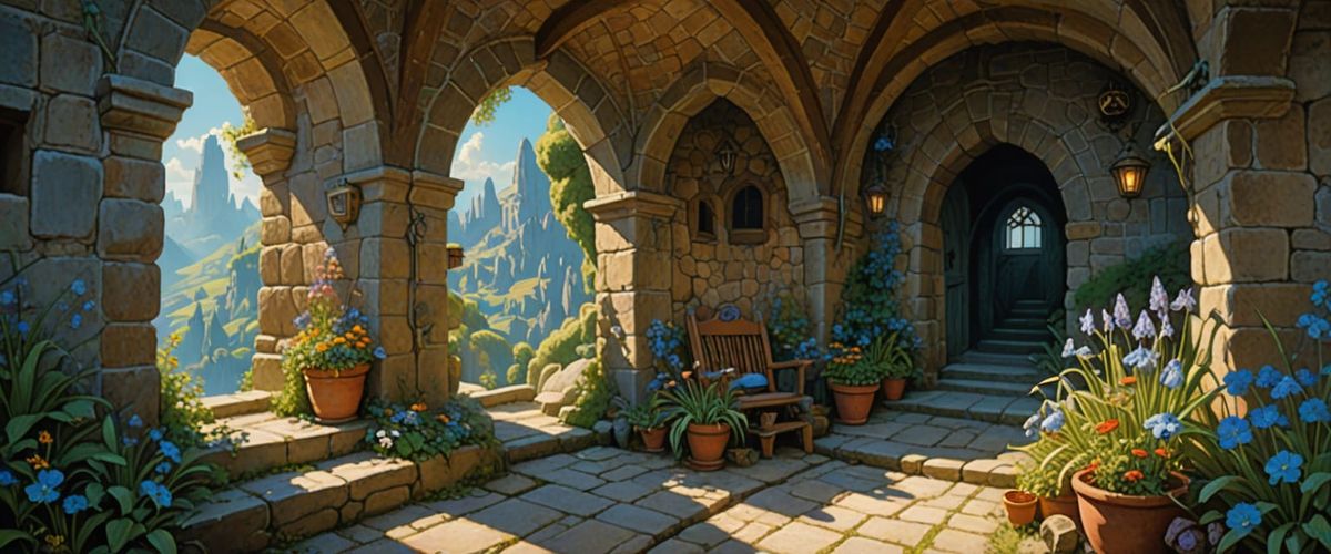 A vibrant image of mysterious passageways with colorful stone walls, flowers, arches, chairs and doorways. The scene is rendered in watercolor and gouache with bright, cheerful colors and volumetric lighting.