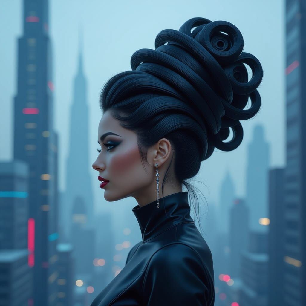 This image shows a woman with elaborate hair styled to resemble futuristic skyscrapers in a neon-lit cityscape. The artwork features sleek metallic textures in a biomechanical style.