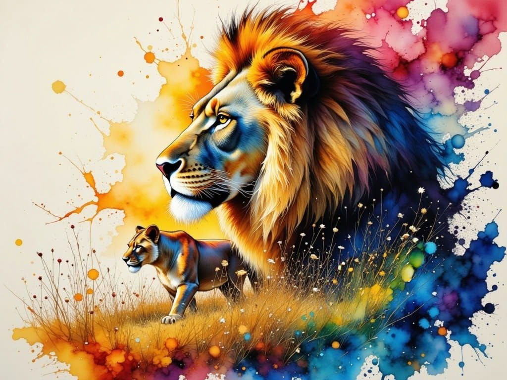 "<lora:Caffeine Splash:1.0> <lora:Akimora:1.0> <lora:PR AlcoholWCGlass:1.0> <lora:Water-ink-colorV2:1.0> Multicolored Splash art, ink splash highly detailed, 8k rendered. Beautifully maned lion’s head in all its glory. Double explosive of lions hunting in tall grass revealed within the painting. Majestic masterpiece quality. (Deformed:-1)(cartoon:-1)."