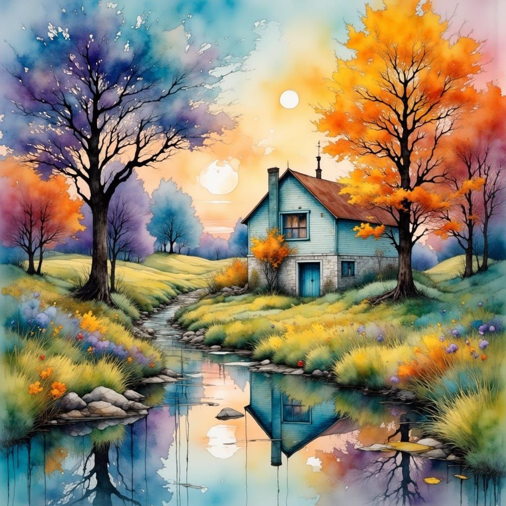 A charming 1960s house with a driveway and classic fencing, surrounded by colorful trees. This idyllic image evokes a dreamy, watercolor-like aesthetic blended with rich textures.