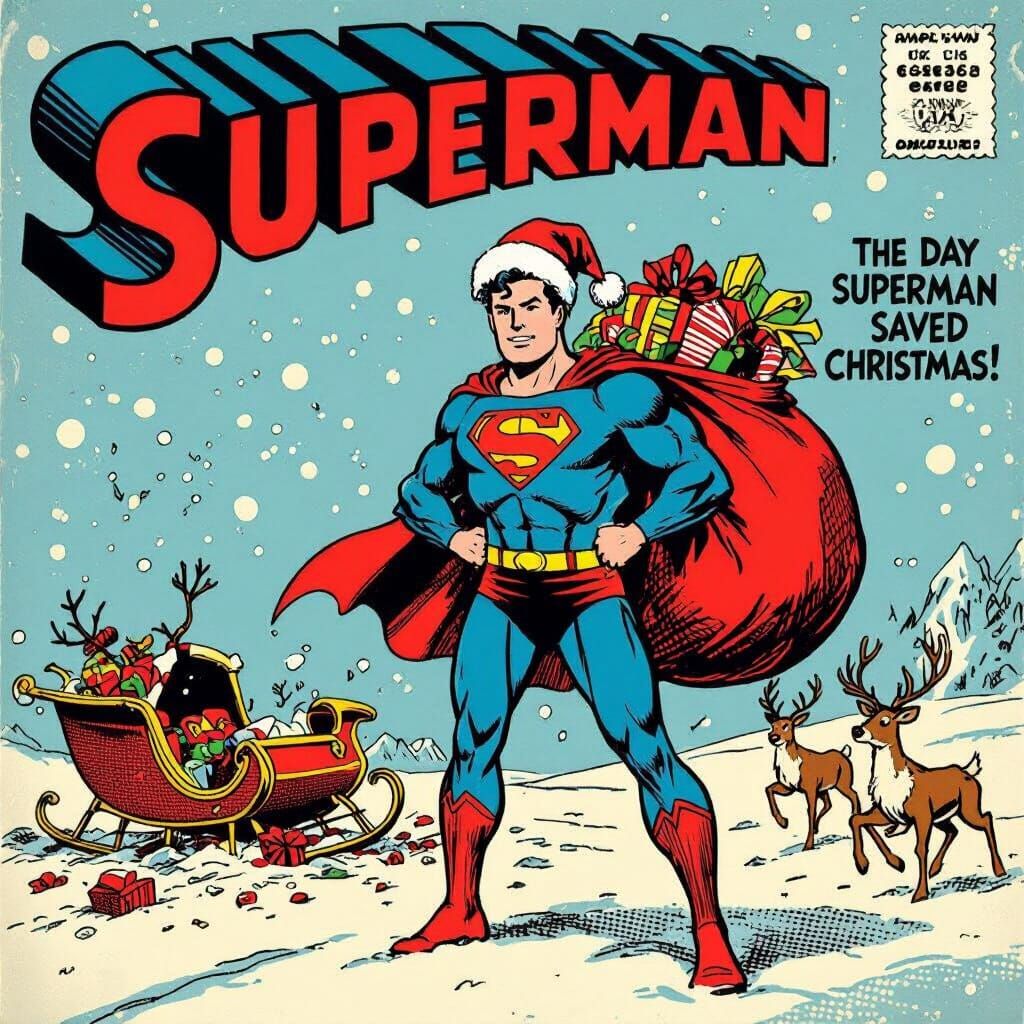 A vibrant 1950s comic book illustration shows Superman in a Santa hat with a giant bag of gifts, rescuing a crashed sleigh with loose reindeer. Bold linework and Ben-Day dots capture dynamic action.
