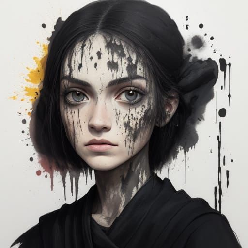 This image shows an abstract expressionist portrait of a witch in a black dress. The painting features expressive brushstrokes, dark colors, and intricate details, rendered in acrylic paint.