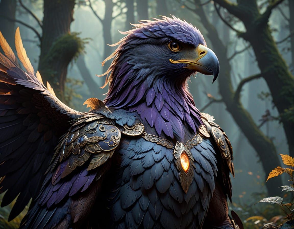 This dark fantasy artwork features a majestic creature with a dappled gray coat, blending seamlessly into a misty forest landscape. With piercing gaze and intricate feather details, the creature exudes power and elegance, reminiscent of art nouveau and dark fantasy styles.